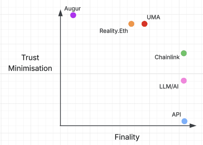 Many existing prediction markets (including Polymarket) already plug in Chainlink for fast priced feeds for markets that do not have dispute mechanisms. For Chainlink to become the everything oracle for prediction markets, we would need to imagine an infinite horizontal scaling across information domains and potential topics. This is an impossibility. In addition, while composable, utilising Chainlink as a sole oracle for a prediction market platform/protocol creates an economic dependancy between market hosts, data providers and users.
